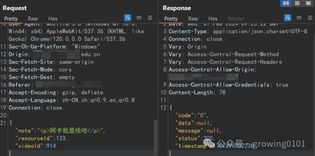 - 点到随意一个视频,可以看到视频的右下角有一个记笔记的功能,我们随意写一点东西,添加一个笔记,此时我们在Burp里面观察分析一下这个笔记是怎么创建的,同时分析一下返回包里面的数据。