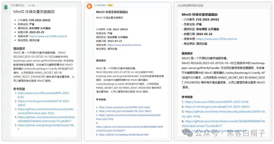 $ ./watchvuln --dt DINGDING_ACCESS_TOKEN --ds DINGDING_SECRET -i 30m