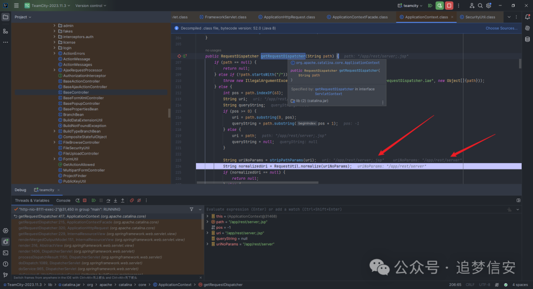 接着一步步按F7,来到org.apache.catalina.core.ApplicationContext#getRequestDispatcher,可以看到就是在这一步传入的路径进行了处理,把本来不存在的/app/rest/server;.jsp变成了存在的/app/rest/server,这样就可以更改正在处理url的DispatcherServlet,从而实现可以访问任意端点: