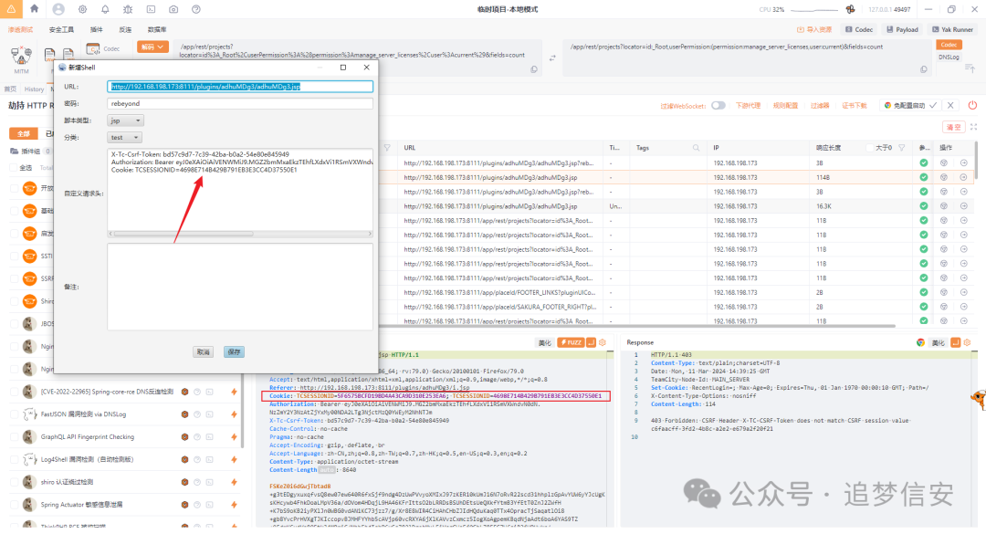 这时候我还没看代码调试,从之前的报错CSRF Header X-TC-CSRF-Token does not match CSRF session value猜想是session对应一个csrf token。尝试从浏览器访问目标,然后获取自动生成的TCSESSIONID: