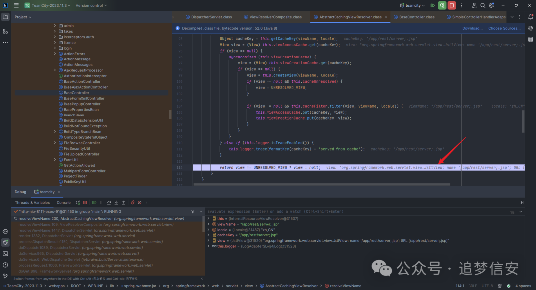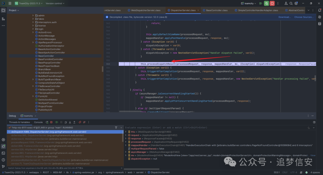 TeamCity中负责请求处理分发的功能点位于TeamCity-2023.11.3\webapps\ROOT\WEB-INF\lib\web-openapi.jar!\jetbrains\buildServer\controllers\BaseController.class,看到handleRequest函数的最后调用了handleRequestInternal,因此我们在handleRequestInternal函数这里打下断点,开启调试: