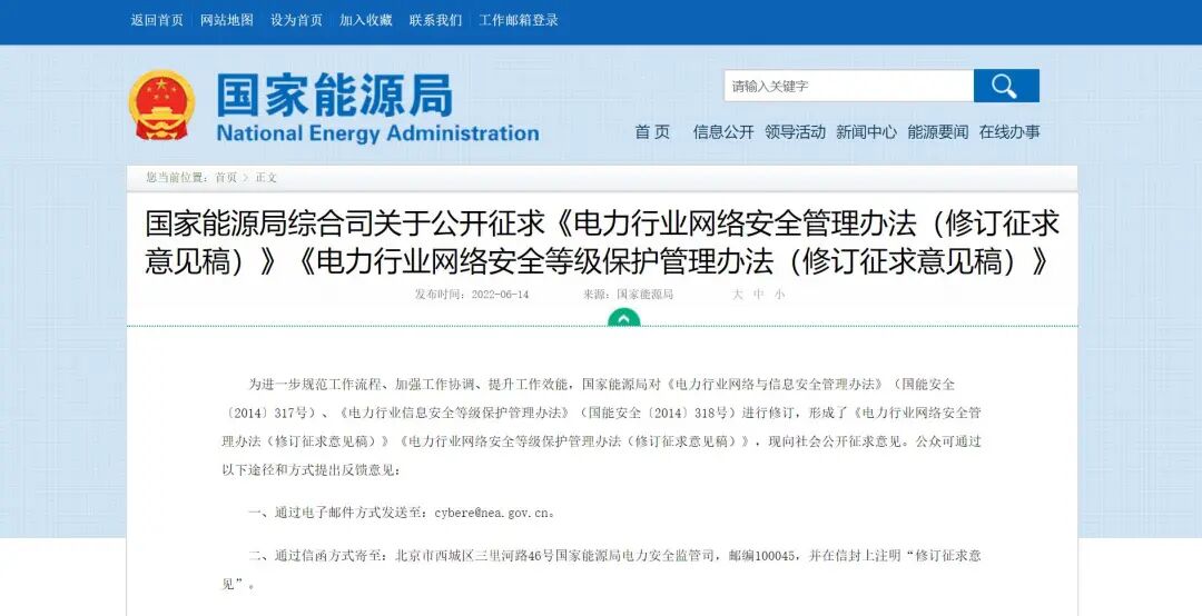 为进一步规范工作流程、加强工作协调、提升工作效能,国家能源局对《电力行业网络与信息安全管理办法》(国能安全〔2014〕317号)、《电力行业信息安全等级保护管理办法》(国能安全〔2014〕318号)进行修订,形成了《电力行业网络安全管理办法(修订征求意见稿)》《电力行业网络安全等级保护管理办法(修订征求意见稿)》,并向社会公开征求意见。