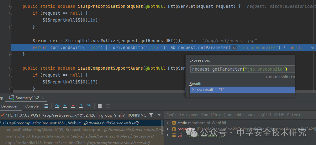 跟进 requestPreHandlingAllowed() -> WebUtil.isJspPrecompilationRequest(),此时获取到的 URI 是