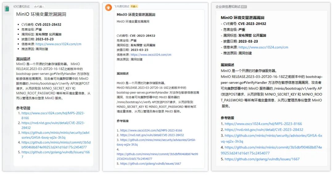 $ ./watchvuln --dt DINGDING_ACCESS_TOKEN --ds DINGDING_SECRET -i 30m