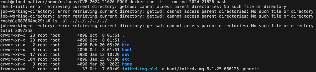 步骤1:构建镜像并执行docker run -it –rm cve-2024-21626 bash命令将容器运行起来