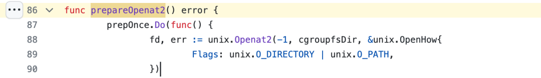 我们可以看出图1中的openFile函数中需要调用prepareOpenat2函数来测试当前系统是否支持Openat2 syscall,但在这里没有使用 O_CLOEXEC flag,如图2所示,同时已经打开的文件并没有被关闭, 这就导致了如果系统支持 Openat2,那么就会存在一个文件描述符泄漏(泄漏的文件描述符指向 /sys/fs/cgroup)的风险。进而攻击者就可以利用该文件描述符的 /proc/self/fd/ 符号链接访问宿主机文件系统[4][8]。