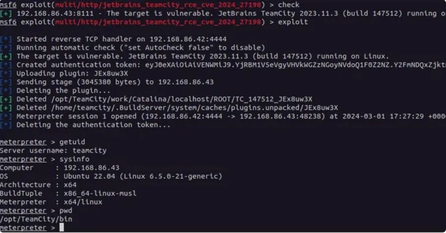 近一个月前,JetBrains 发布了包含另一个漏洞(CVE-2024-23917,CVSS 评分:9.8)的修复程序,该漏洞还可能使未经身份验证的攻击者获得对 TeamCity 服务器的管理控制权。
