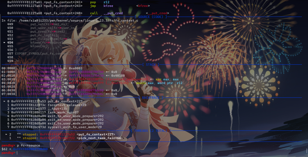 随后下断在 fscontext_release,然后 continue 过去,走到 kfree 这和位置可以发现 source 被释放。