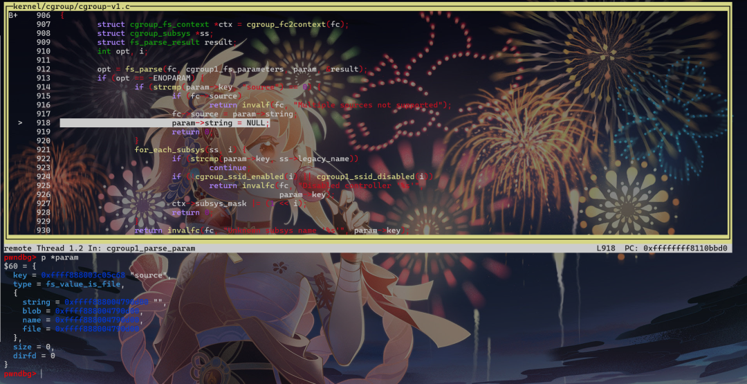 这里会有调用刚刚的 cgroup1_parse_param,当然也可以直接下断点 continue 过去。