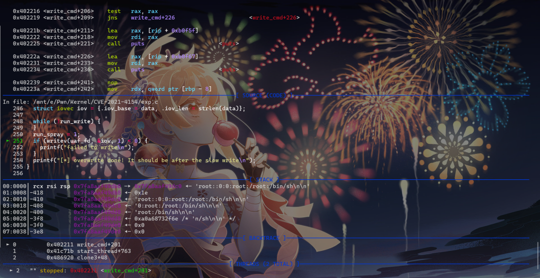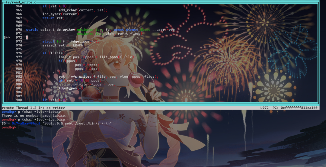 这里采用 writev 写入大量数据使得文件拿锁的时间加长。为了调试 exp,可以用 add-symbol-file 命令去添加符号,这里可以选择断 write_cmd 的 writev 函数,因为这里会因为写入数据量过大而长期持有锁,writev 就会尝试持续获得锁。