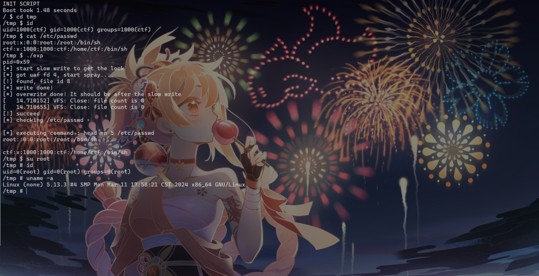 依然是采用 busybox,方法和之前是一致的,看我最开始的环境搭建即可,这里可以提前把 EXP 编译进去然后打包文件系统。