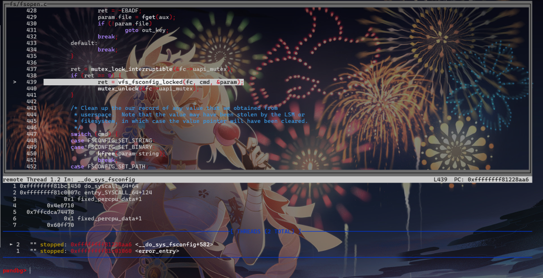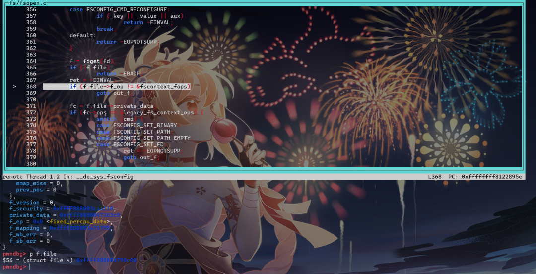 第一步打断点 __do_sys_fsconfig,然后跟到图示这个位置,可以发现获取到了文件结构了。
