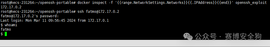 docker inspect -f '{{range.NetworkSettings.Networks}}{{.IPAddress}}{{end}}' openssh_exploit