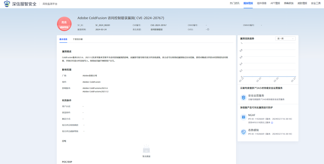 2024年3月28日,深瞳漏洞实验室监测到一则Adobe ColdFusion组件存在任意文件读取漏洞的信息,漏洞编号:CVE-2024-20767,漏洞威胁等级:高危。