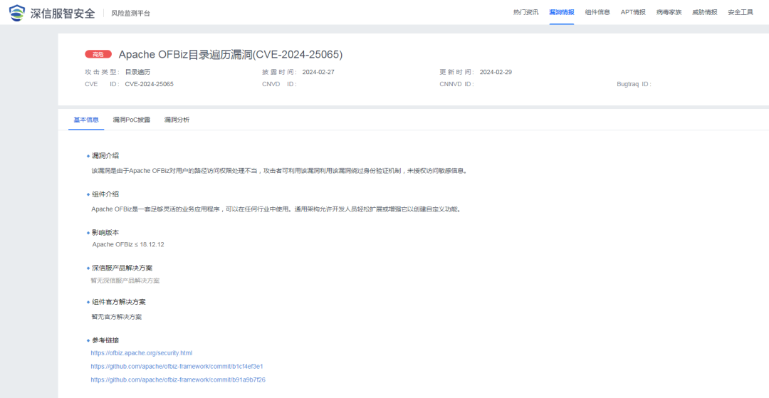 2024年2月29日,深瞳漏洞实验室监测到一则Apache OFBiz存在目录遍历漏洞的信息,漏洞编号:CVE-2024-25065,漏洞威胁等级:高危。