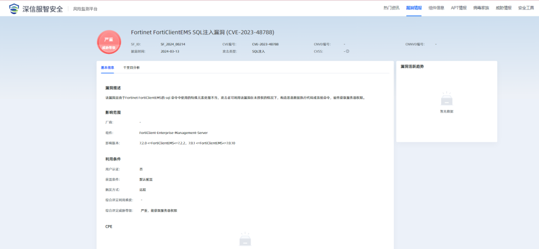 2024年3月14日,深瞳漏洞实验室监测到一则Fortinet FortiClientEMS存在SQL注入漏洞的信息,漏洞编号:CVE-2023-48788,漏洞威胁等级:严重。