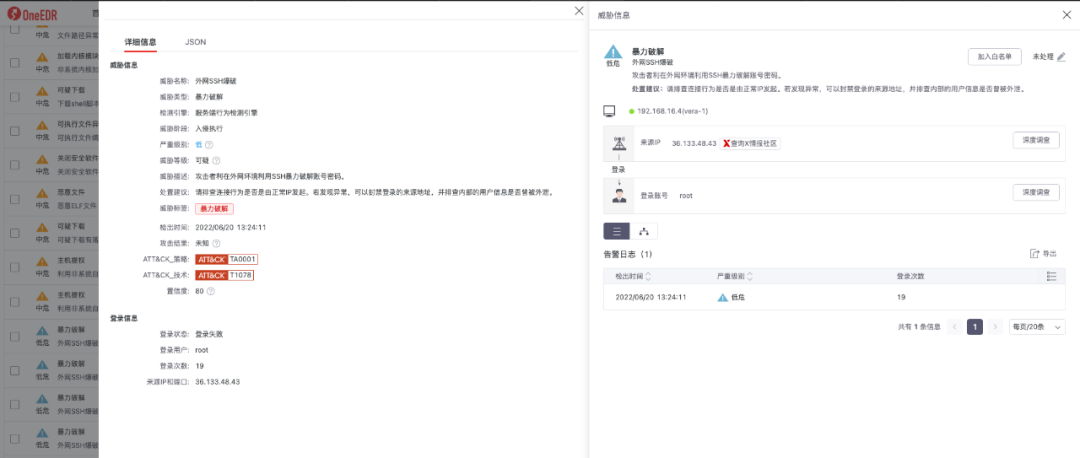 OneEDR通过进程链路图,还原内网攻击路径。如果是Webshell,可通过TDP联动找到源IP;如果是爆破,OneEDR能直接找到源IP