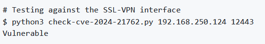 要检测FortiGate SSL VPN 是否容易受到 CVE-2024-21762 的攻击,可使用如下漏洞检测脚本工具,用法如下: