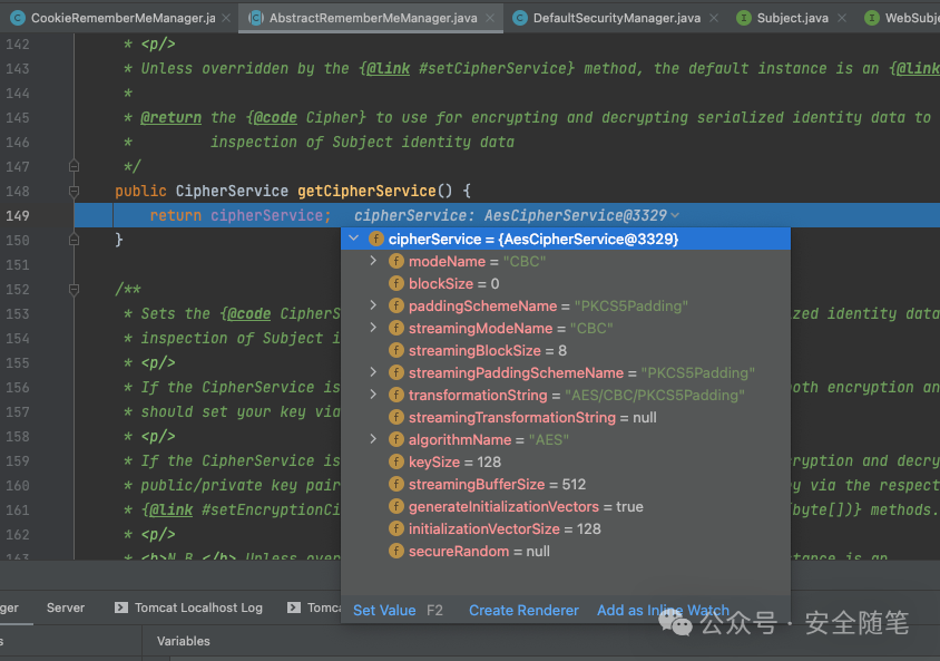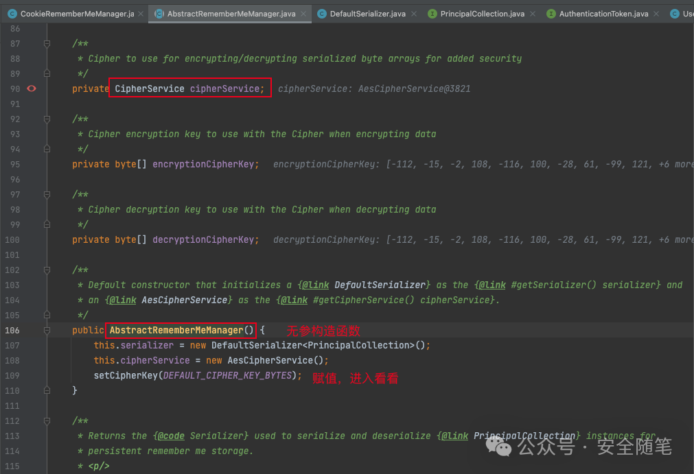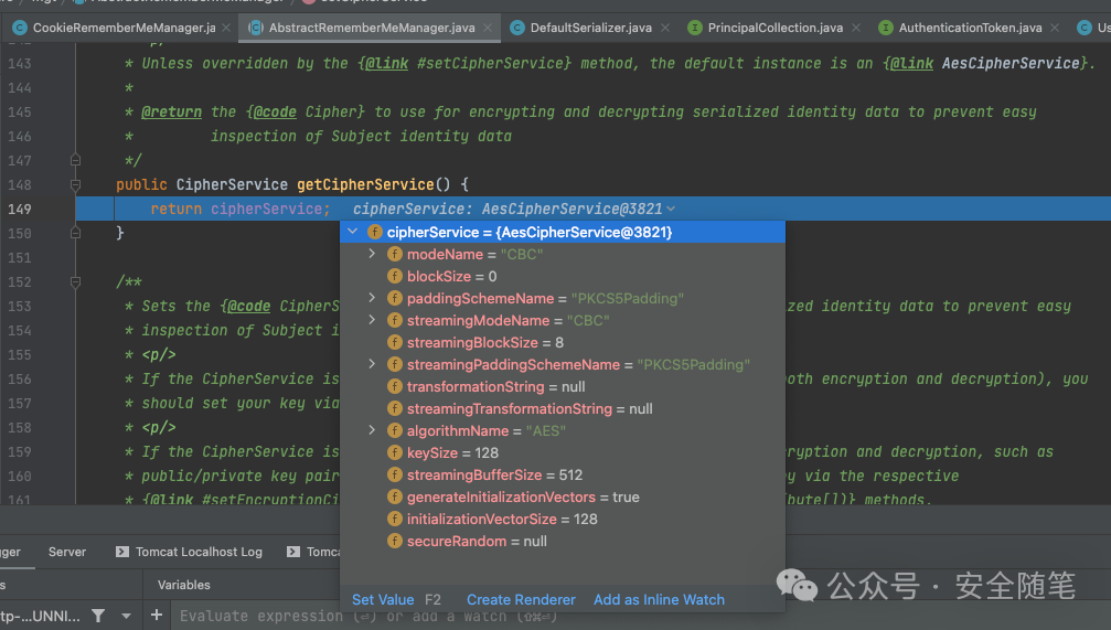 AbstractRememberMeManager类的一个属性,那么在类初始化完成后应该就给这个值赋值了,所以上图可以看到加密算法的一些属性: