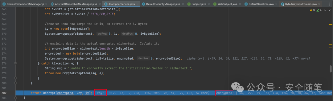 然后走到cipherService.decrypt方法,这个是繁琐的aes加密算法的细节实现,不再详细看了。最终走到:return decrypt(encrypted, key ,iv)