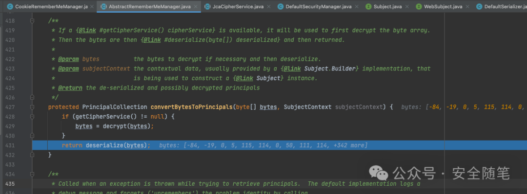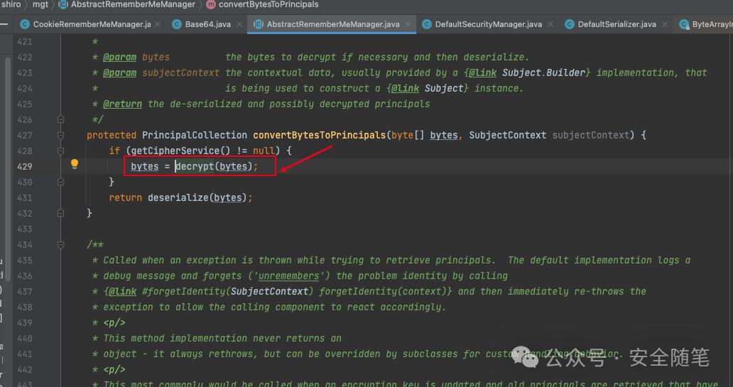 AbstractRememberMeManager.getRememberedPrincipals,跟进到convertBytesToPrincipals方法中: