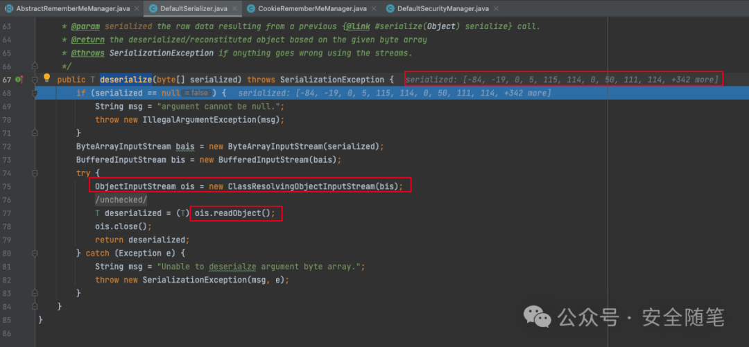 重点来了,继续跟进来到:DefaultSerializer.deserialize方法: