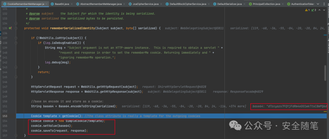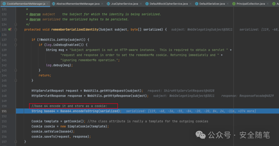 跟进来到CookieRememberMeManager.rememberSerializedIdentity方法,参数中有一个serialized(加密后的序列化字节数组):