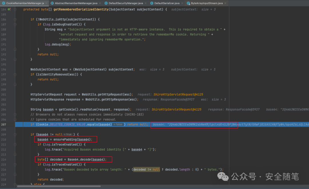 获取请求带过来的rememberMe cookie base64值,进行base64解码返回。