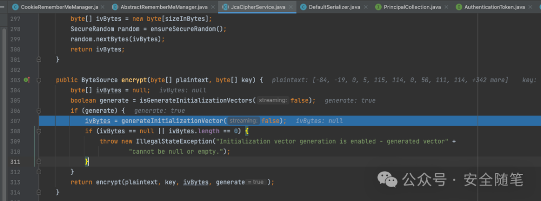 继续分析,来到下面这行代码,跟进看看,进入JcaCipherService类的encrypt加密方法: