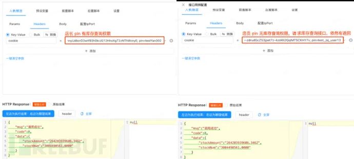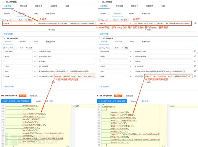 分析入参:由于入参中存在 orderId 和 wjPin 两个字段来标识用户身份,因此修改其为其他同级别权限用户信息,进行水平越权测试。修改前和修改后的请求及返回结果如图 3.3 所示,令当前登录用户为 A 用户,修改请求入参的用户信息为 B 用户,可以发现,修改入参后,A 用户依然可以访问到 B 用户的订单详情,也就是当前登录用户可以访问到其他用户的订单详情,说明该接口存在水平越权逻辑漏洞。