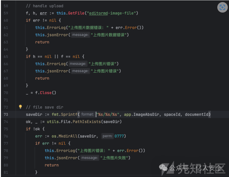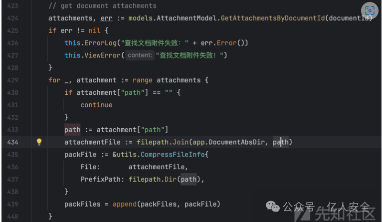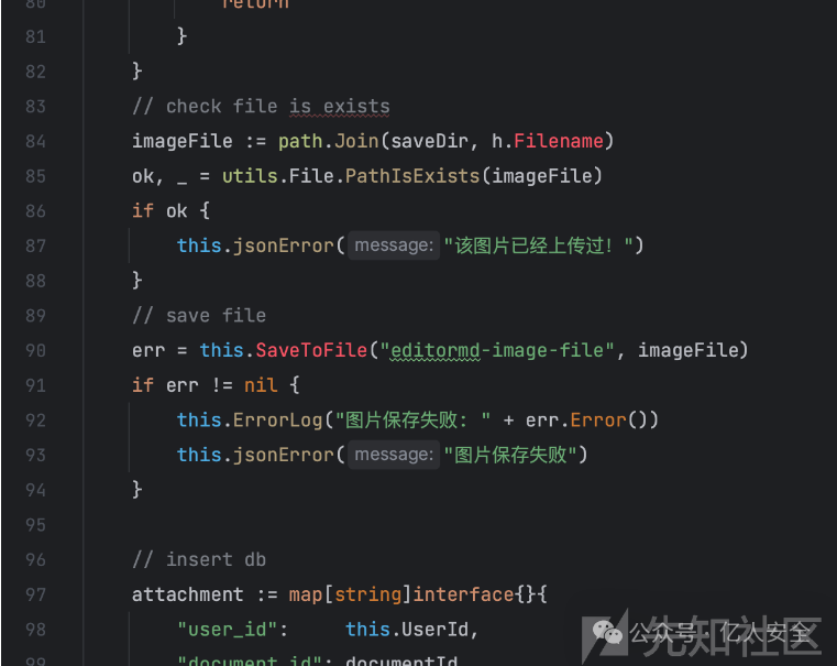 结果并没有出现类似的问题,再去代码里看看相关的处理逻辑app/controllers/page.go:367 ,发现打包的图片地址是从数据库中检索的,然后使用了 filepath.Join 来拼接,那如果我们attachment[“path”] 是存在 ../ 这种目录穿越字符,那就能够造成目录穿越.因此接下来去查看下上传图片的逻辑。