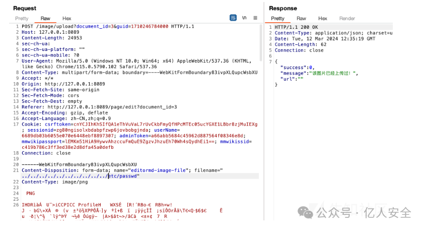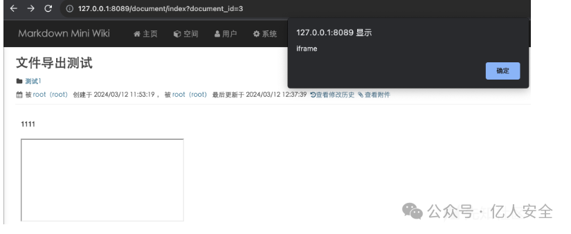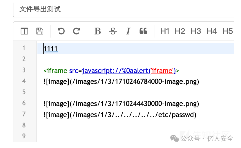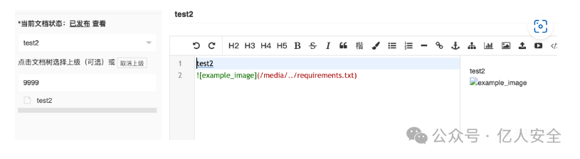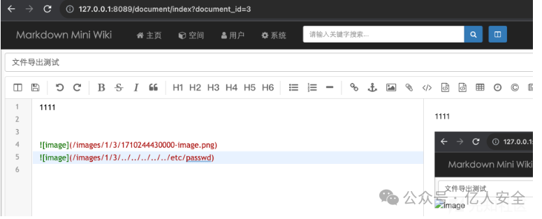 既然这个地方的文件导出功能存在问题,那类似的,其他markdown的导出是否也存在同样的问题呢?带着这个疑问,我尝试去找了下类似于Mrdoc的其他开源在线文档系统,找到了一个用go语言写的mm-wiki:https://github.com/phachon/mm-wiki跳过环境搭建,先来黑盒测试一下功能,我先上传了一张照片,按照同样的逻辑加入了一个带有穿越路径的资源,如下,接着导出: