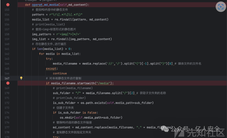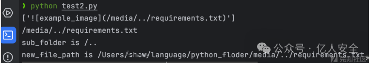 接着会从匹配到的每个字符串中取出括号() 中的内容, 并进行资源目录查找,其中要求了加载资源地址需要是以 /media 开头, 到这里基本上都能猜到payload的形式了, 无非就是 /media/../../../xxx ,先吧这个函数取出来测试一下, 其中self.media_path 等一些路径变量我就先随便模拟了: