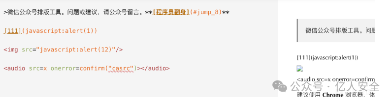 但是,上面大部分的xss都是基于源码去分析了程序逻辑才找到漏洞,那在平时的黑盒测试中我们应该如何去挖掘markdown中的xss问题呢?个人的理解:就是多尝试一些比较少见的标签去测试,举些例子: