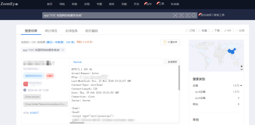 根据ZoomEye网络空间搜索引擎关键字 app:”H3C 校园网自助服务系统” 对潜在可能目标进行搜索,共得到1581条IP历史记录。主要分布在中国、巴西等国家。(ZoomEye搜索链接: