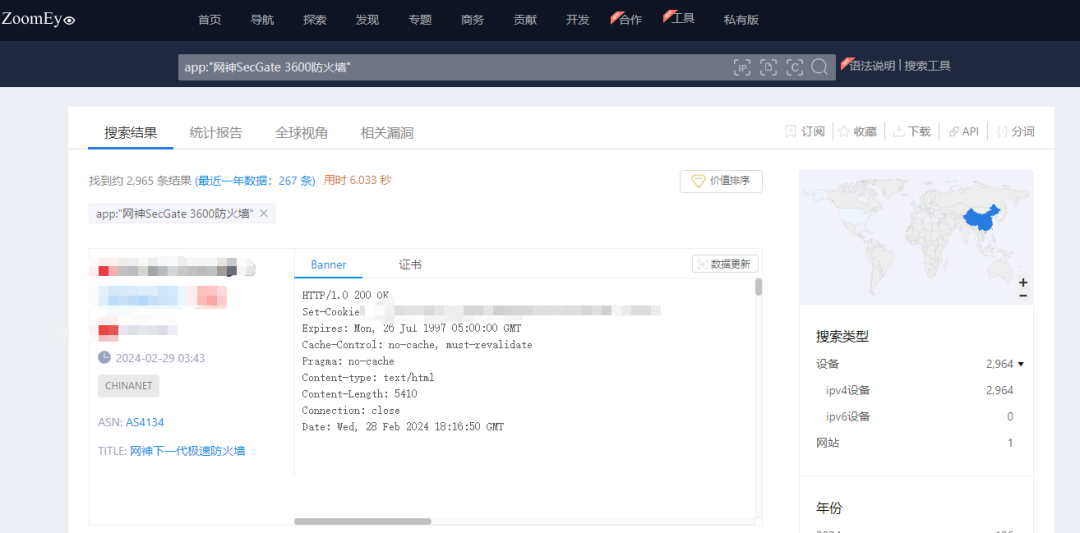 根据ZoomEye网络空间搜索引擎关键字 app:”网神SecGate 3600防火墙” 对潜在可能目标进行搜索,共得到2965条IP历史记录。主要分布在中国等国家。(ZoomEye搜索链接: