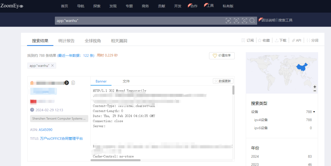 根据ZoomEye网络空间搜索引擎关键字 app:”wanhu” 对潜在可能目标进行搜索,共得到788条IP历史记录。主要分布在中国吉林、北京等地。(ZoomEye搜索链接: