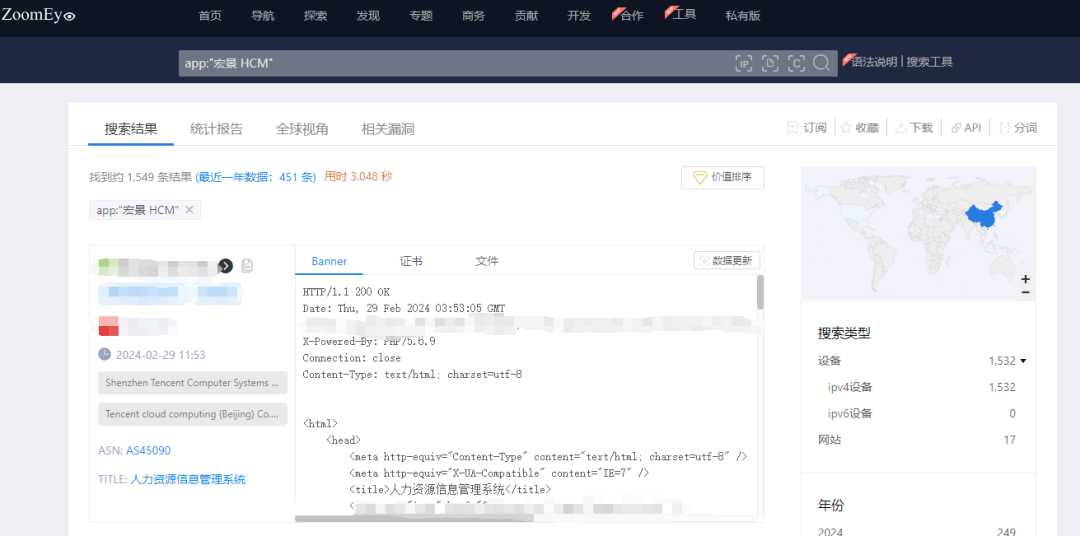 根据ZoomEye网络空间搜索引擎关键字 app:”宏景 HCM” 对潜在可能目标进行搜索,共得到1549条IP历史记录。主要分布在中国、英国等国家。(ZoomEye搜索链接: