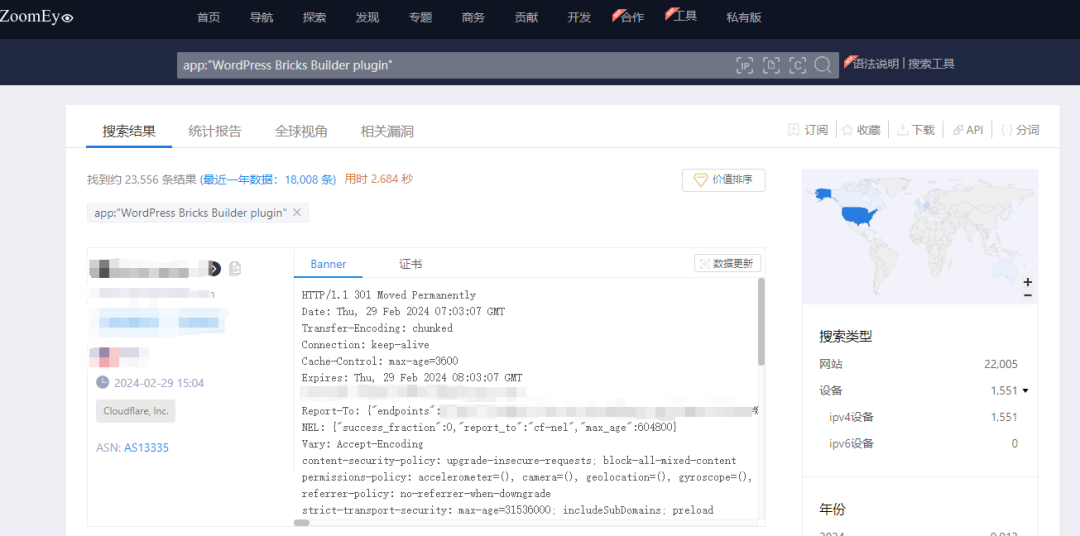 根据ZoomEye网络空间搜索引擎关键字 app:”WordPress Bricks Builder plugin” 对潜在可能目标进行搜索,共得到23556条IP历史记录。主要分布在美国、德国等国家。(ZoomEye搜索链接:
