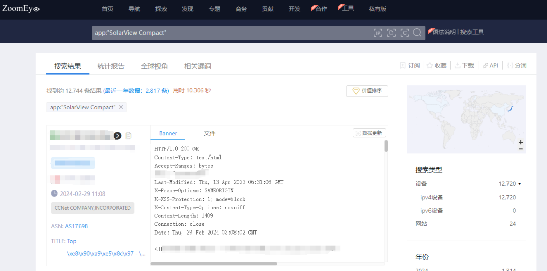 根据ZoomEye网络空间搜索引擎关键字 app:”SolarView Compact” 对潜在可能目标进行搜索,共得到12744条IP历史记录。主要分布在日本、中国等国家。(ZoomEye搜索链接: