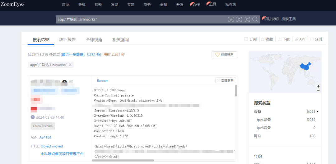 根据ZoomEye网络空间搜索引擎关键字 app:”广联达 Linkworks” 对潜在可能目标进行搜索,共得到6215条IP历史记录。主要分布在中国、美国等国家。(ZoomEye搜索链接: