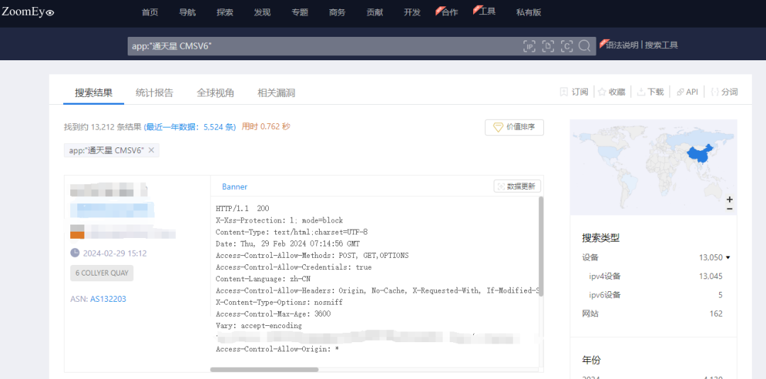 根据ZoomEye网络空间搜索引擎关键字 app:”通天星 CMSV6″ 对潜在可能目标进行搜索,共得到13212条IP历史记录。主要分布在中国、俄罗斯等国家。(ZoomEye搜索链接: