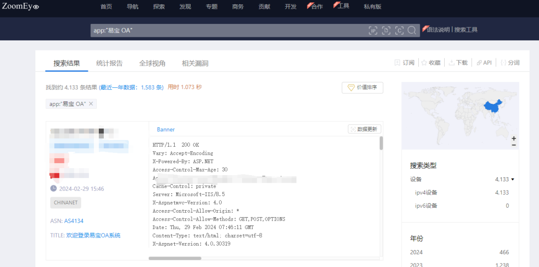 根据ZoomEye网络空间搜索引擎关键字 app:”易宝 OA” 对潜在可能目标进行搜索,共得到4133条IP历史记录。主要分布在中国广东、江苏等地。(ZoomEye搜索链接: