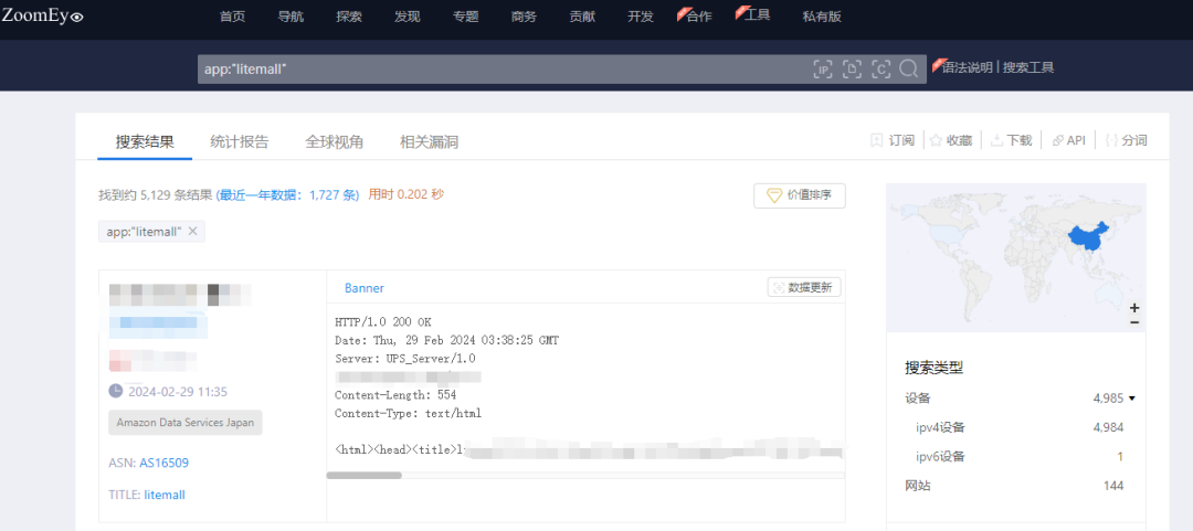 根据ZoomEye网络空间搜索引擎关键字 app:”litemall” 对潜在可能目标进行搜索,共得到5129条IP历史记录。主要分布在中国、美国等国家。(ZoomEye搜索链接: