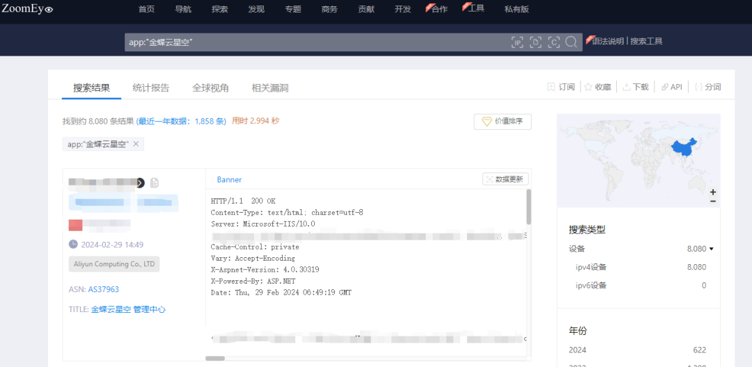 根据ZoomEye网络空间搜索引擎关键字 app:”金蝶云星空” 对潜在可能目标进行搜索,共得到8080条IP历史记录。主要分布在中国、新加坡等国家。(ZoomEye搜索链接: