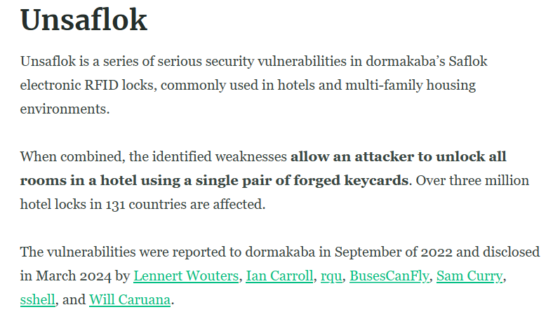 最近一份研究报告显示,在常用于酒店的dormakaba公司旗下的Saflok RFID电子锁中,存在着一系列严重安全漏洞,允许攻击者伪造门卡任意解锁使用该类电子锁的所有酒店房间。全球131个国家的300多万家酒店的门锁都受此影响。