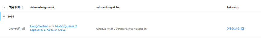 CVE-2024-21408 Windows Hyper-V 拒绝服务漏洞由奇安信天工实验室安全研究员发现并提交。